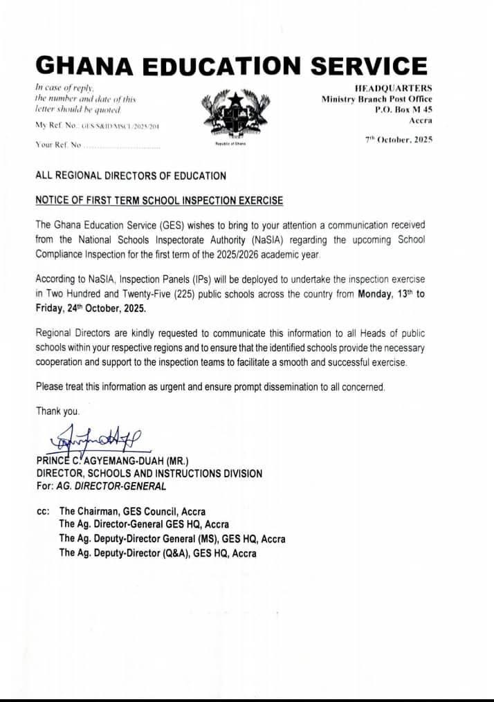The Ghana Education Service (GES) has announced that the National Schools Inspectorate Authority (NaSIA) will embark on a nationwide School Compliance Inspection exercise for the first term of the 2025/2026 academic year.