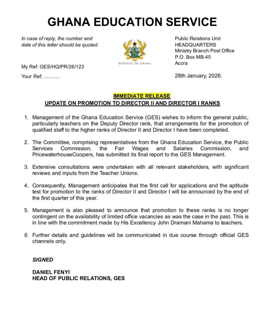 Importantly, Management announced that promotion to these ranks will no longer be dependent on the availability of limited office vacancies, as was previously the case. This development, the statement noted, is in line with a commitment made by His Excellency John Dramani Mahama to teachers.