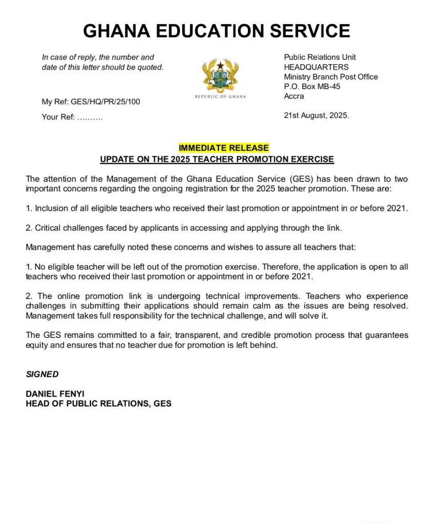 The Ghana Education Service (GES) has issued an update to address concerns raised by teachers regarding the ongoing registration for the 2025 promotion exercise.