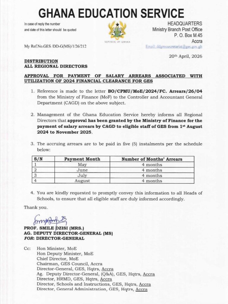 The Ghana Education Service (GES) has announced that approval has been granted for the payment of salary arrears owed to its staff, following financial clearance issued in 2024.