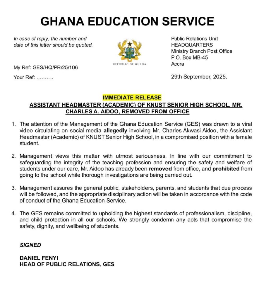The Ghana Education Service (GES) has removed Mr. Charles Akwasi Aidoo, Assistant Headmaster (Academic) of KNUST Senior High School, from office following the circulation of a viral video allegedly involving him in a compromised position with a female student.
