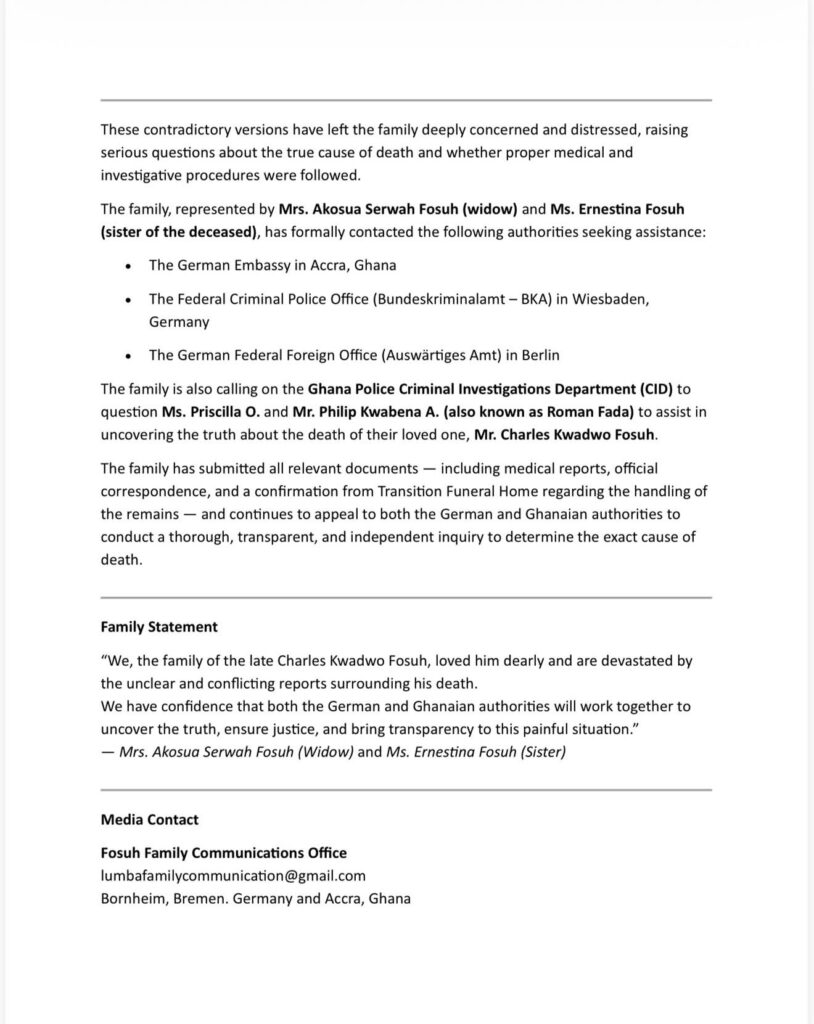 “We, the family of the late Charles Kwadwo Fosuh, loved him dearly and are devastated by the unclear and conflicting reports surrounding his death. We have confidence that both the German and Ghanaian authorities will work together to uncover the truth, ensure justice, and bring transparency to this painful situation,” the statement concluded.