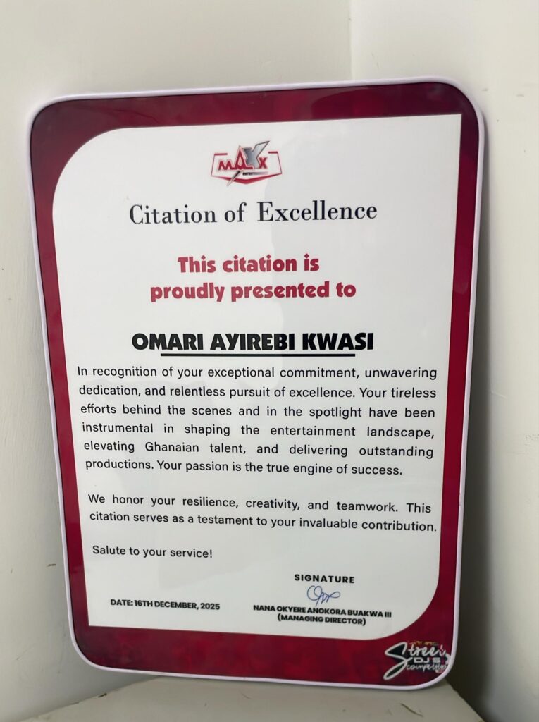 The citation, signed by Nana Okyere Anokora Buakwa III, Managing Director of Maxx Entertainment, praised DJ Blay for his exceptional commitment and unwavering dedication to excellence. It pointed at his tireless work both behind the scenes and in the spotlight, noting that his efforts have played a key role in shaping the entertainment landscape and uplifting emerging talents across the country.