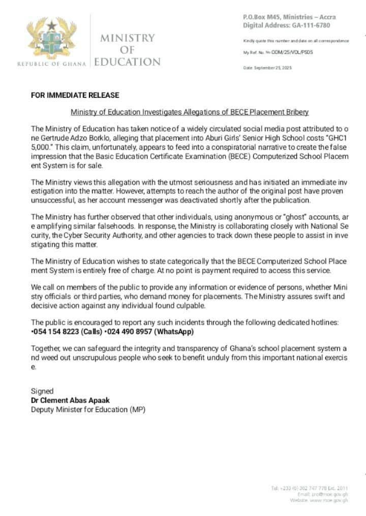 The allegation, attributed to one Gertrude Adzo Borklo, suggested that Ghana’s Basic Education Certificate Examination (BECE) Computerized School Placement System (CSSPS) could be bought. According to the Ministry, the post is not only misleading but also part of a deliberate attempt to create public mistrust in the placement process.