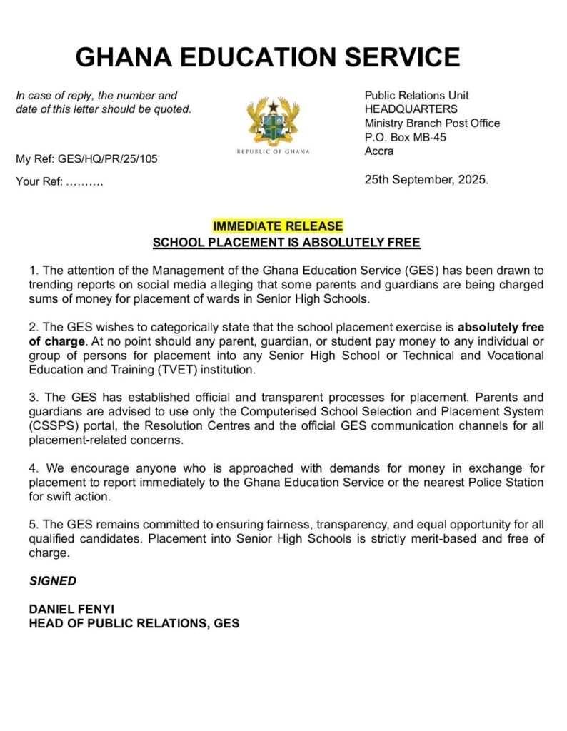 In a similar letter signed by DANIEL FENYI, HEAD OF PUBLIC RELATIONS, GES — The GES categorically stated that the school placement exercise is absolutely free of charge. At no point should any parent, guardian, or student pay money to any individual or group of persons for placement into any Senior High School or Technical and Vocational Education and Training (TVET) institution.